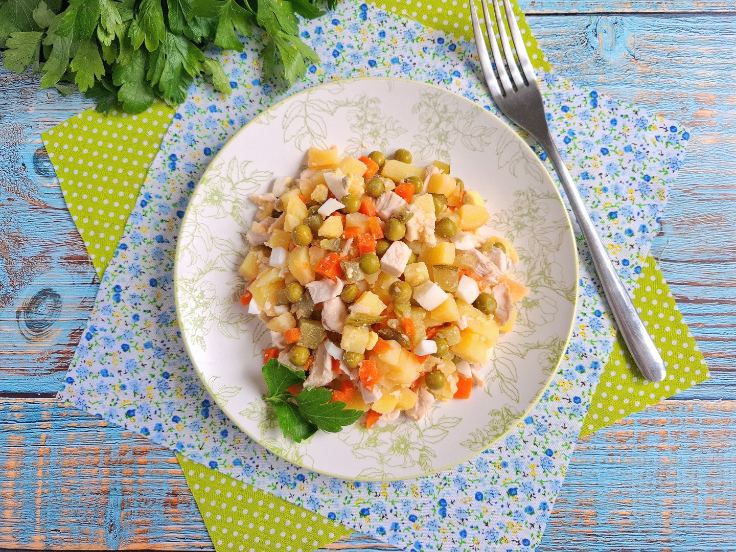 Оливье получился сытным и лёгким одновременно. Никакой тяжести, а вкус превосходный!