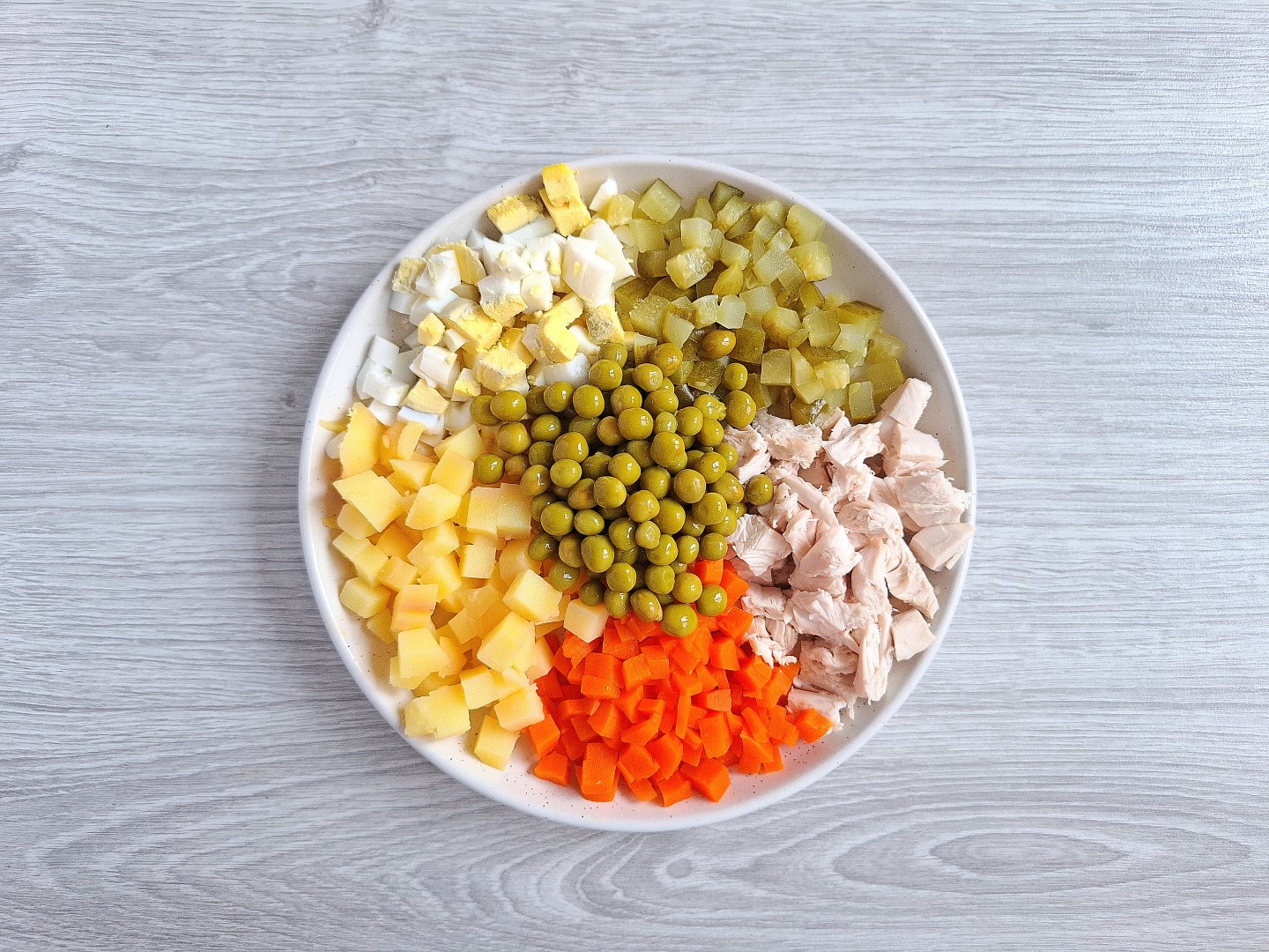 Картошку, морковь и яйца отварила до готовности, остудила и тоже нарезала кубиком. Горошек выбрала качественный, ведь от него зависит вкус всего салата. Огурчики у меня домашние, маринованные, не сильно солёные.