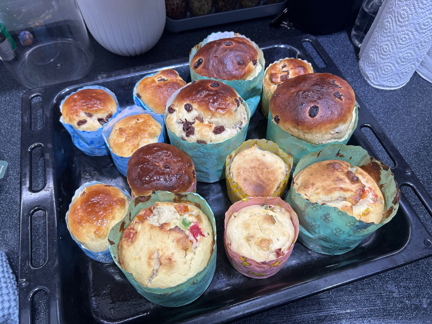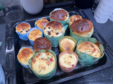 Мне очень нравится такие новинки классического продукта, можно почувствовать себя настоящим шефом выпечки 🔥 расчетной муки мне хватило, не добавляла, хотя очень хотелось, но действительно чем дольше замешивало, тем тесто перестало липнуть и получилось очень красивым и однородным. Из начинки я добавила цукаты и немного карамели. Трудность возникла на моменте переноса заготовки в бумажную форму, нужно было смазать наверное руку, чтобы тесто легко отцепилось, но в итоге заготовка оказалась на месте, не развалившись 😂. Выпекала в газовой духовке 35 минут. Очень и очень высоко поднялся ккраффин! Если кто-то любит сладко, то сахара можно увеличить значительно. Получилось красиво и необычно, спасибо автору ❤️