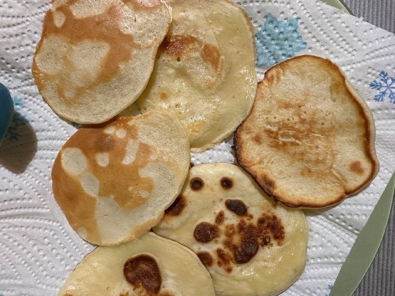 Для завтрака этот рецепт просто находка! Возможно у меня не совсем прошла реакция кефира и разрыхлителя (соды к сожалению не оказалось в наличии), и блины получились не как на картинке высокие) но по размеру все же как обычные 3 блинчика вместе