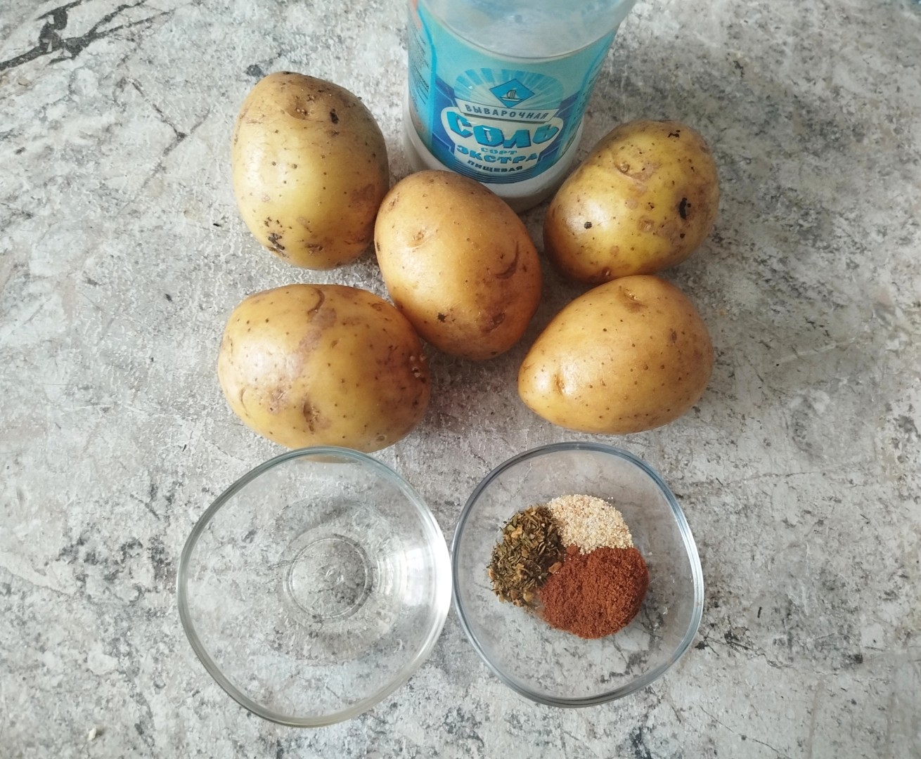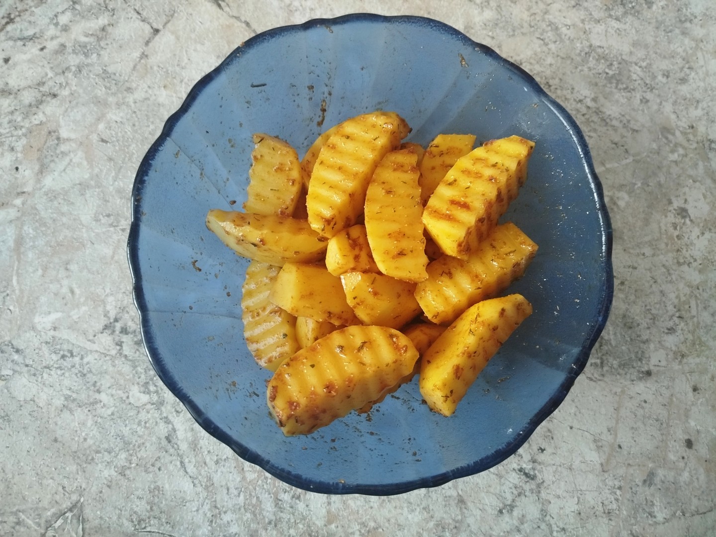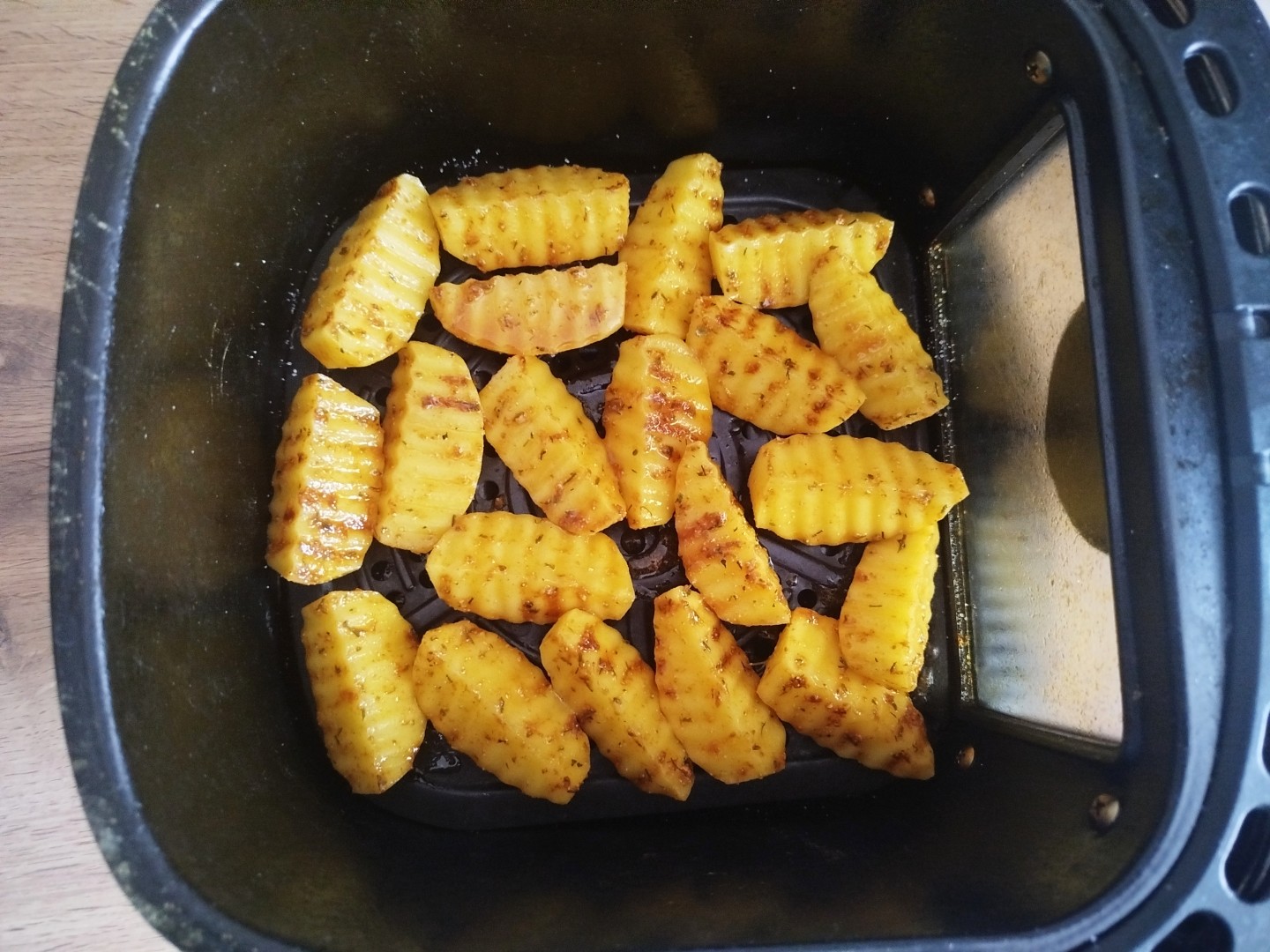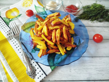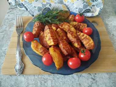 Картошку почистила и фигурным ножом разрезала каждую на 4 дольки,приготовила растительное масло и все специи,посыпала специями картошку и вылила масло,хорошо перемешала в отдельной миске. Пока все это делала включила аэрогриле прогреться,потом выложила на решетку картошку в 1 слой и поставила запекаться. В моем аэрогриле я запекала минут 30-35,готовность просто проверяла ножом.