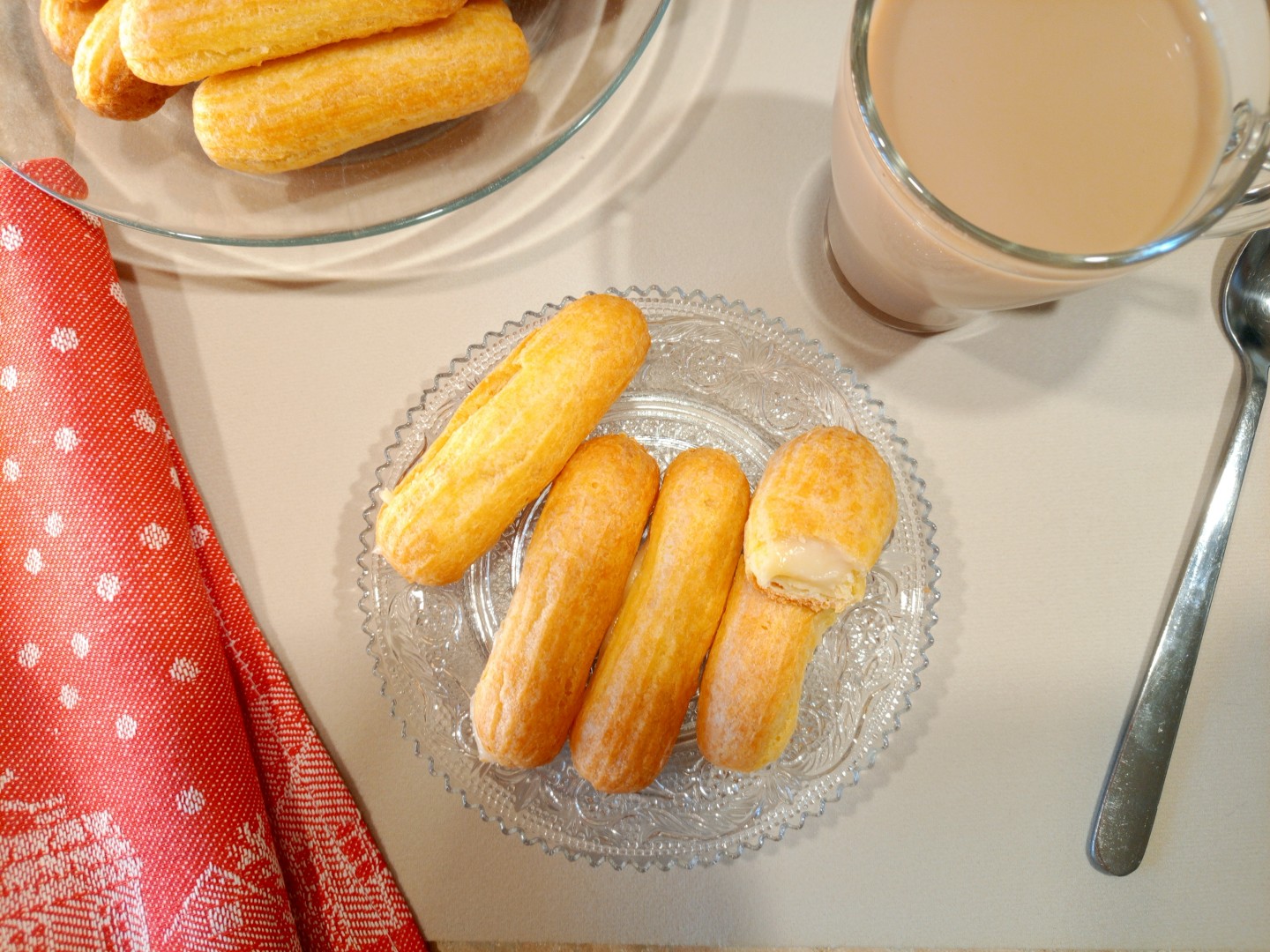 Я решила сделать маленькие эклерчики, на один — два укуса. Хватило теста на 1 противень 38*40 см, всего 15 штук.