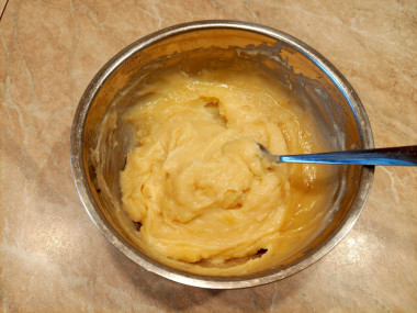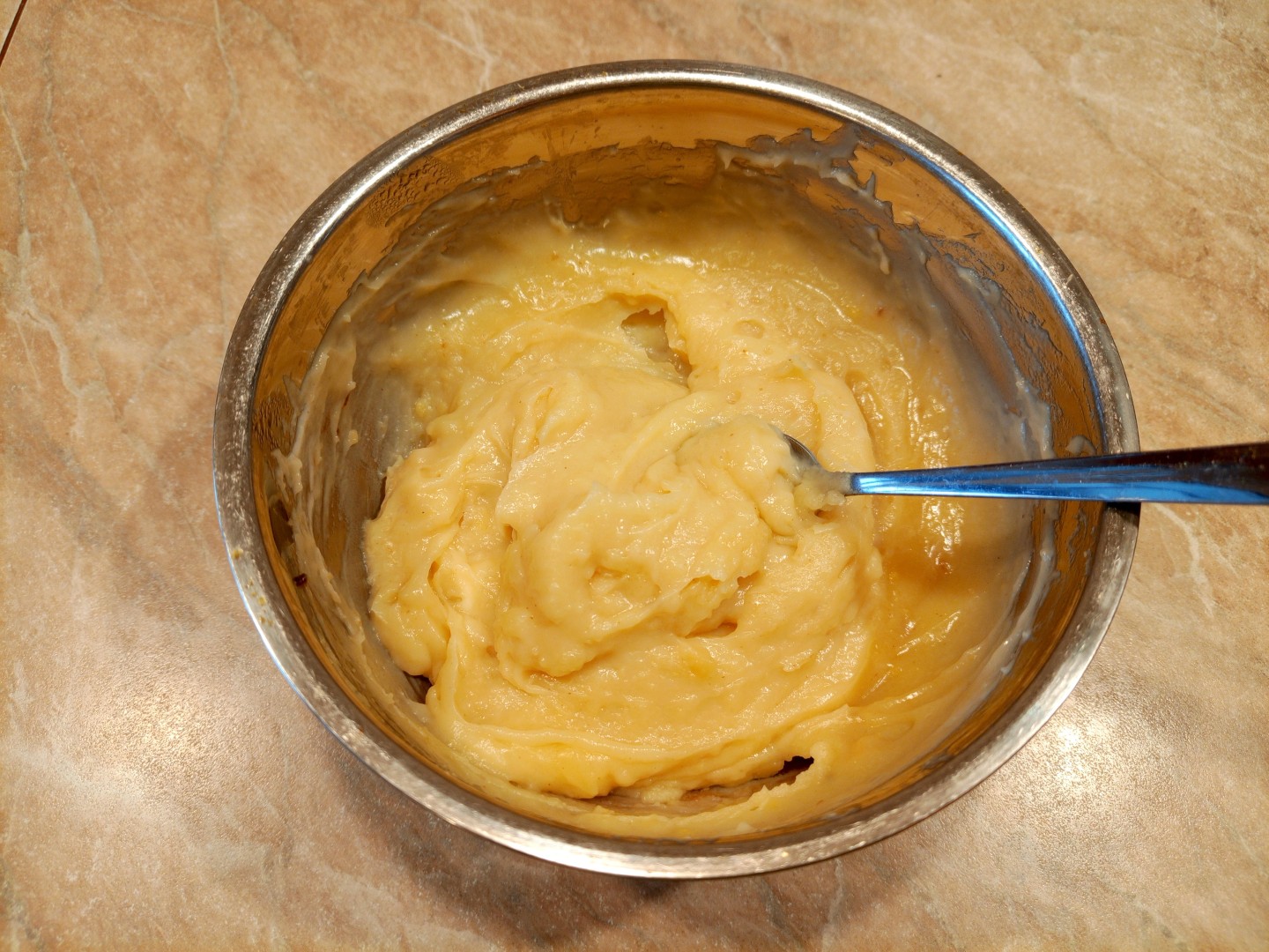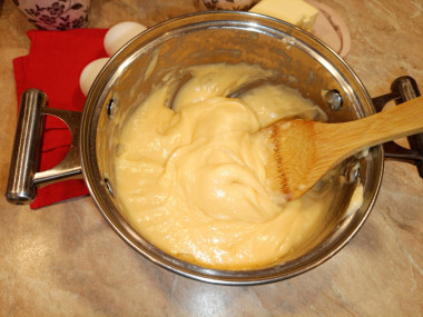 Тесто получилось отличное. Не пугайтесь, что при добавлении яиц тесто сначала разваливается на крупные кусочки, и только после тщательного вымешивания лопаткой становится гладким и однородным. И да, приготовление заварного теста требует сильных рук и скорости:)