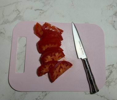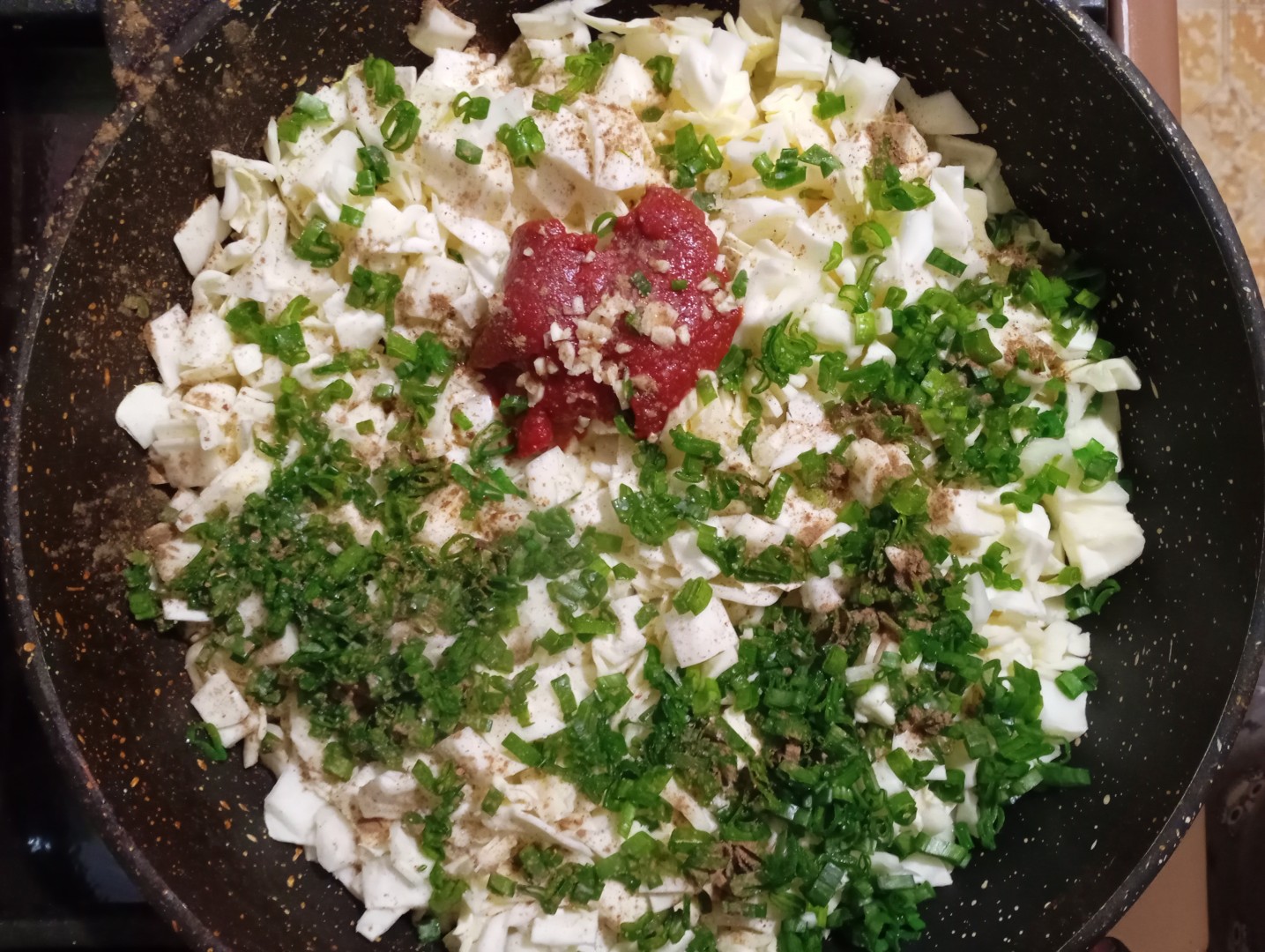 1. Я очень люблю пряные вкусы, поэтому помимо томатной пасты добавила немного зеленого лука, зубчик чеснока и смесь молотых перцев.