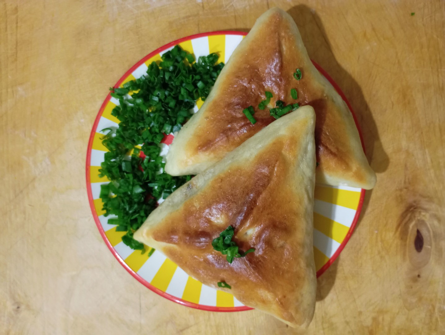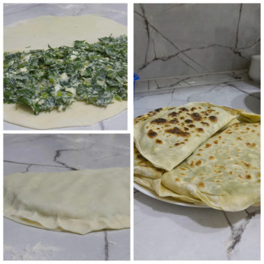 Получилось очень вкусно и сытно! Из зелени для начинки взяла пучок зеленого лука, пучок кинзы и также укропа, и теста идеально хватило на количество начинки. Само тесто очень мягкое, быстро раскатывается. С каждой стороны жарила чуть меньше трех минут. Использовала сухую сковороду с пергаментом чтоб не пригорало.