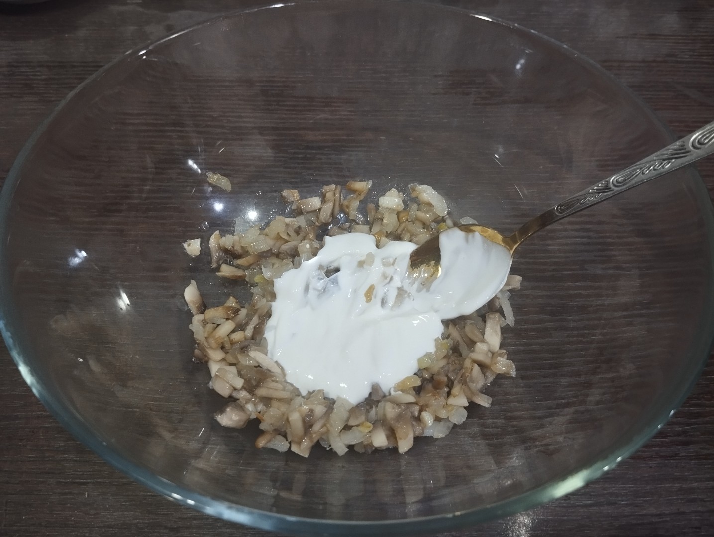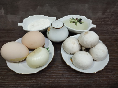 Пока отваривались яйца, обжарила лук с грибами. Остывшие яйца порезала пополам,вынула желтки и добавила к грибам. Заправила сметаной и перемешала. Начинила половинки яиц и подала к столу.