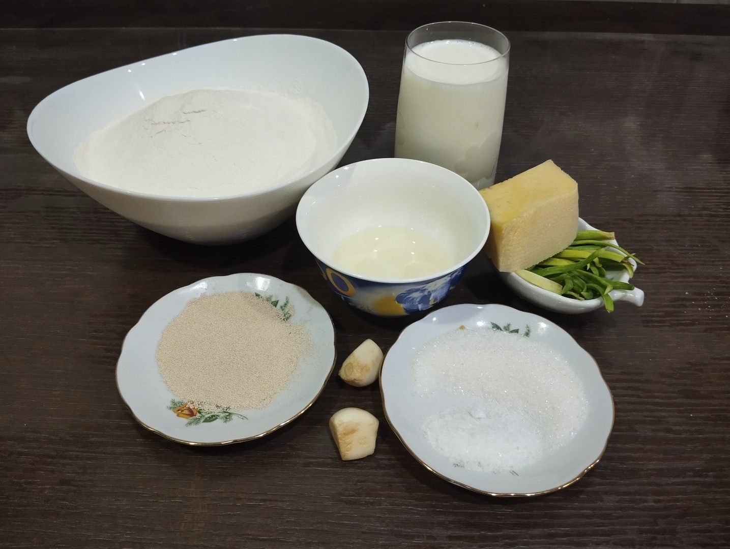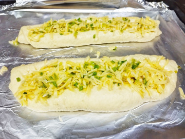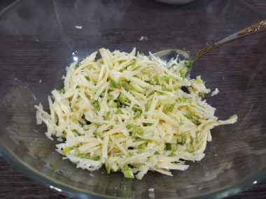 Для начинки использовала зелёный лук, который мелко порезала. Сыр натерла на крупной тёрке. Соединила с измельчённым чесноком,маслом,солью и перемешала.