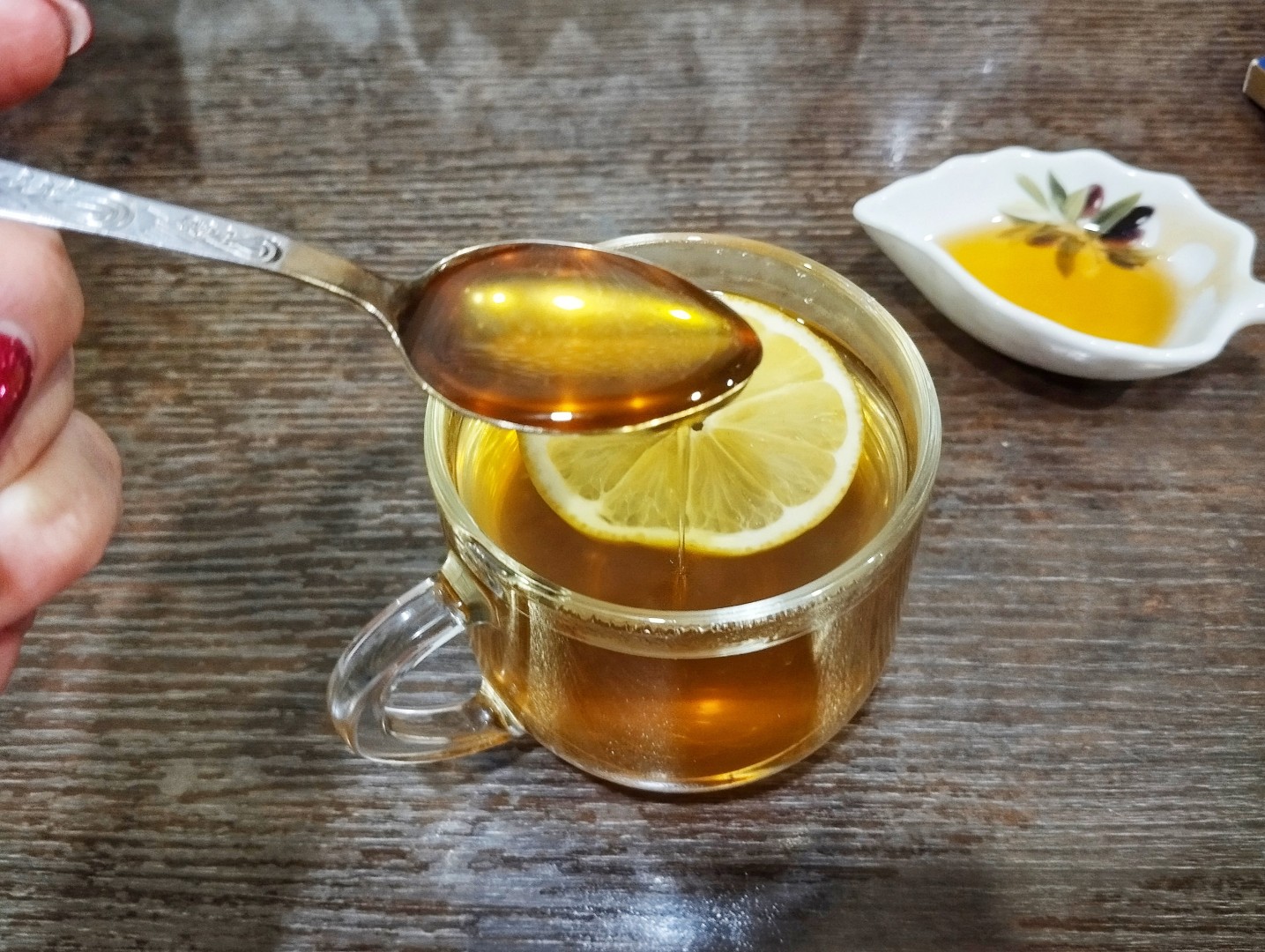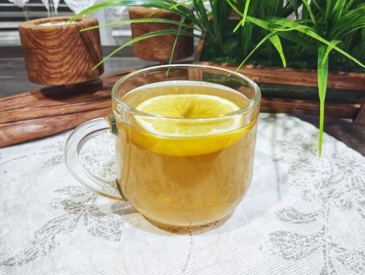 За окном метель, снегопад , захотелось вкусного горячего чая. Нашла отличный рецепт зелёного чая с имбирём лимоном и медом. Имбирь нарезала тонкими ломтиками, добавила в заварной чайник вместе с зелёным чаем,палочкой корицы. По совету автора в чашку добавила колечко лимона и ложку мёда.
