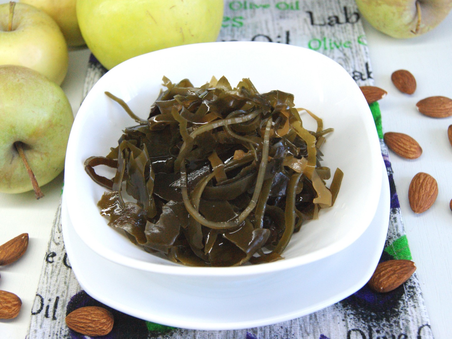 Несколько раз промыла капусту и залила водой. Оставила на ночь. По утру снова промыла. Напомню, что я взяла 20 грамм морской капусты, а по итогу ее получилось 120 грамм, получается что она впитала в себя 100 мл воды. Увеличилась она так же и в объеме. Моя используемая тарелка диаметром 16 см и высотой 5 см, на 400 мл. Это к тому, что бы вы смогли сориентироваться по емкости в которой будете замачивать капусту и количеством воды для маринада.