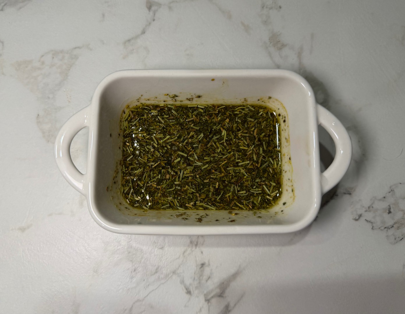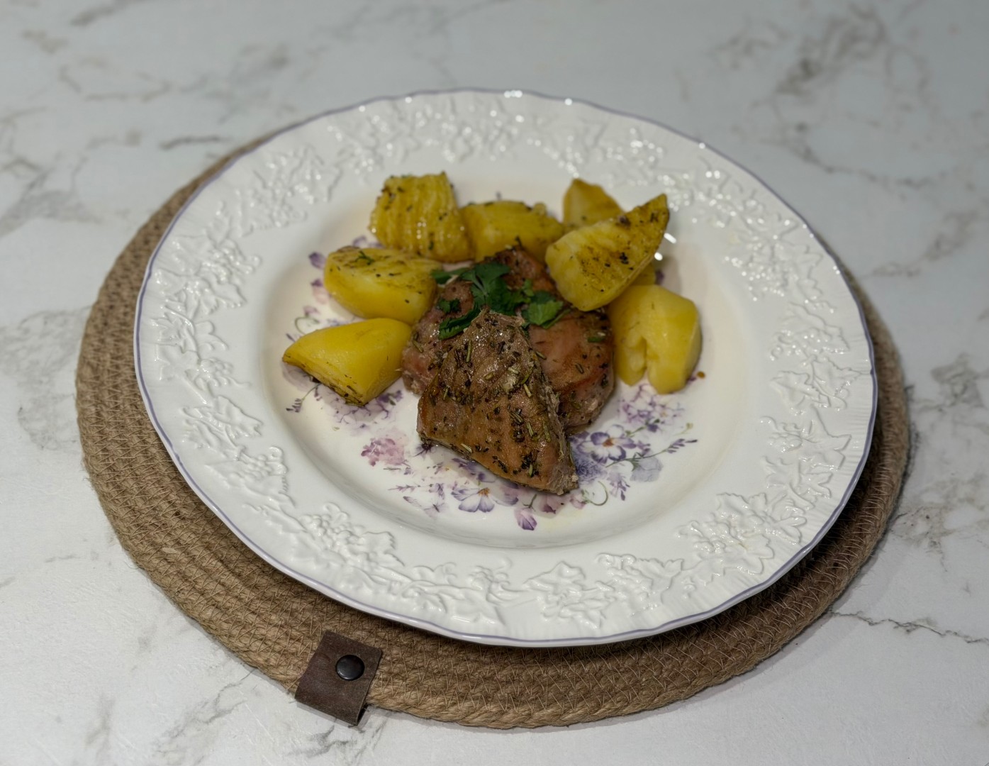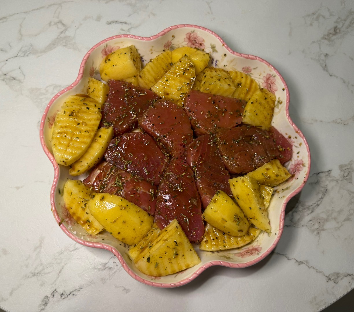 Рыба получилась очень сочной, с насыщенным вкусом лимона и специй. Добавила в маринад побольше травок, оливковое масло, лимонный сок, соевый соус, соль не добавляла. Решила запечь тунец вместе с картофелем. Обмазала филе со всех сторон, а пока рыба мариновалась, почистила и нарезала картошку. Здесь главное брать самый молодой картофель подходящего сорта, чтобы он успел приготовиться вместе с рыбой за полчаса. Его полила тем же маринадом. У меня все пропеклось равномерно.
