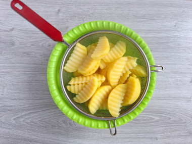Картошка благодаря маринаду приобрела аппетитный золотистый цвет и пикантный чесночный аромат. От выбора картофеля многое зависит. Советую выбирать сорта не слишком рассыпчатые, но с высоким содержанием крахмала. Тогда дольки останутся целыми. Предварительное отваривание делает картошку мягкой внутри, а снаружи при запекании образуется золотистая корочка.