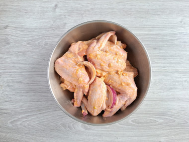 Мы любим целые крылышки, поэтому кончики не отрезала. Для маринада использовала соевый соус, майонез, карри, паприку и свежий чеснок. Немного подсолила по вкусу, добавила лук с оставила мариноваться на 2 часа. Такой маринад сделал крылышки невероятно вкусными, мясо мягкое и нежное.