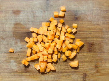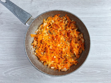 Для поджарки лук нарезала мелким кубиком, а морковь натерла на терке с крупными зубцами. Затем слегка обжарила на растительном масле.