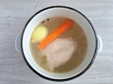 Бульон варила из куриной грудки на косточке для большего навара. Для того, чтобы бульон стал вкуснее, добавила очищенную луковицу, морковку, лавровый лист и душистый перец. Бульон процедила, а мясо сняла с костей и нарезала кусочками.