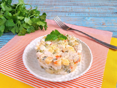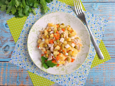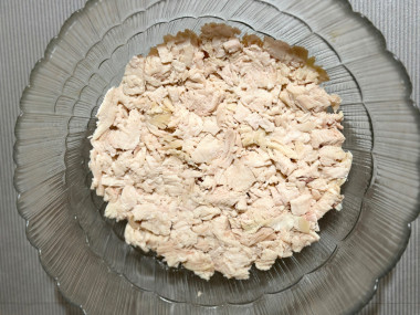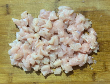 Предварительно отварила куриную грудку с добавлением морковки и веточек петрушки. Мясо вынула из бульона и остудила под крышкой, чтобы не обветрилось. Кстати бульон получился вкусным, заморозила его для приготовления супа. Охлажденную грудку нарезала мелким кубиком.