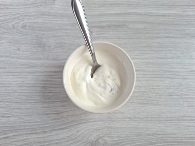 Для заправки смешала густой йогурт, соль и черный перец. Когда пробовала, решила, что мне не хватает кислинки, поэтому добавила пару капель лимонного сока. Йогурт специально выбирала густой термостатный, чтобы он лучше связал ингредиенты в салате.