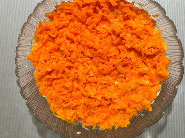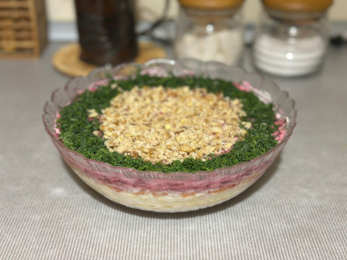 Как же хорошо, что сейчас мы живём в такое время, когда такой красивый салат становится участником повседневного меню, а не только готовится по праздникам. Укладывала слои в прозрачную салатницу в последовательности автора, каждый слой промазывала майонезом. Курицу посыпала черным перцем, а между слоями моркови и свеклы - сухим чесноком. Украсила свежим укропом и тертыми орехами. Салат получился очень плотным, сытным, вкусным. Спасибо Мария ❤️