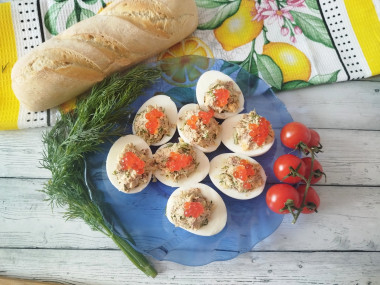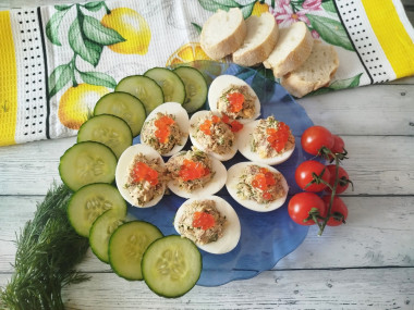 Отварила яйца,разрезала их напополам,желтки положила в миску,туда же положила тунец,натерла сыр,огурец тоже решила натереть на тёрке и немного отдала с него лишнюю жидкость,добавила майонез и специи,мелко нарезанный укроп,все смешала и нафаршировала половинки белков, сверху украсила красной икрой чуть-чуть и подала на стол. Гости оценили,получилось очень вкусно,нежно и главное быстро готовится!