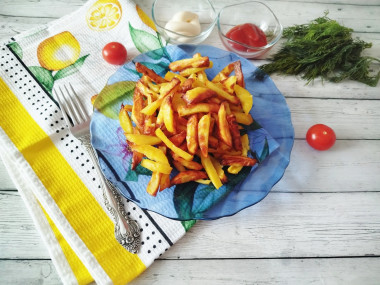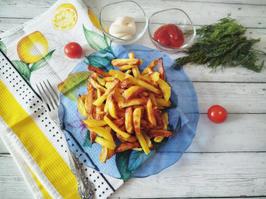 Взяла картошку,почистила,нарезала на брусочки, сбрызнула маслом растительным,хорошенько перемешала. В это время аэрогриль нагрелся(заранее включила),положила на решетку картошку в один стой. В конце посолила. Готовила 30 минут. Я сделала специально картошку более обжаренной,так сын попросил. На вкус ему очень понравилось,я тоже попробовала и тоже осталась довольна результатом! Внутри она остаётся мягкая,а снаружи хрустящая. Главное соблюдать все рекомендации по приготовлению как в рецепте и у вас все замечательно получится. Если и у вас есть аэрогриль обязательно попробуйте приготовить в нем картошку фри!