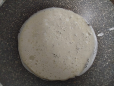 Очень люблю блины и не смогла пройти мимо рецепта блины с красной икрой. Приготовила всё,что для них нужно,муку променяла для воздушности,смешала все ингредиенты блендером с насадкой венчиком,мне так больше нравится, получается быстрее и проще,чем обычным венчиком. Поставила сковороду на огонь разогреть и потом начала печь блины,они легко переворачиваются.