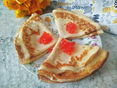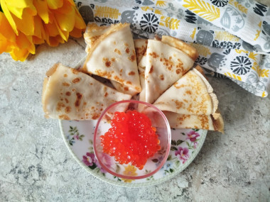 Получаются блины нежные и вкусные,а уж с красной икрой это просто объедение! Мой ребенок тоже с огромным удовольствием ел блинчики,но только с джемом,он так больше любит. Так что блины отличные, рецепт что надо!
