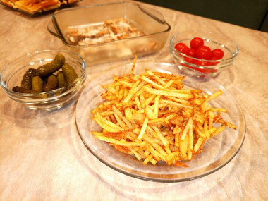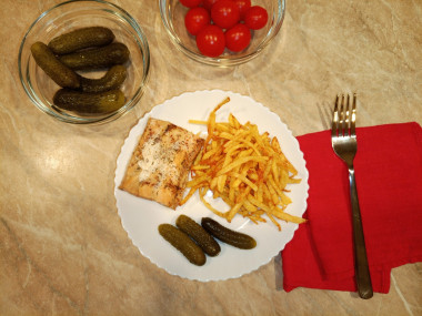 Чем тоньше нарезка и темнее цвет, тем более хрустящим получился картофель. Я подавала картофель пай с запеченным в духовке рыбным филе, маринованными огурчиками и свежими помидорками черри. Получилась отличная быстрая вариация на тему «Fish and Chips».