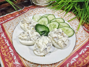 Яйца, фаршированные грибами готовила в качестве закуски. Времени на приготовление ушло совсем немного, что особенно актуально при нежданном приходе гостей.