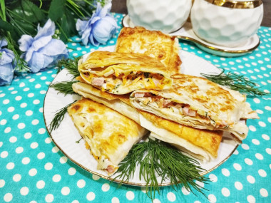 Готовятся просто и быстро, а результат впечатляющий! Ингредиенты идеально сочетаются между собой, дополняя друг друга по вкусу. Начинка получилась сочной, а лаваш хрустящий. У меня были круглые лавашики, которые я свернула конвертиками,а при подаче разрезала.