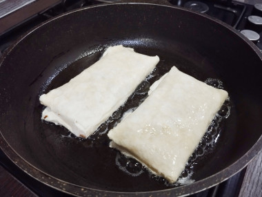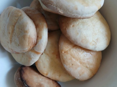 Решила сделать из него пирожки с луком и яйцом. Приготовила для них начинку,на лепила пирожков и подарила их на сковороде,жарились они быстро,подрумянились с одной стороны,перевернула,поджарились с другой, выложила их на тарелку с салфеткой чтобы впиталось лишнее масло.