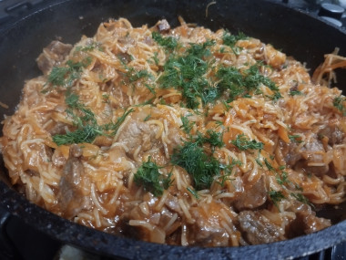 Захотелось приготовить что-то простое и вкусное на обед. Нашла отличный рецепт вермишель с мясом на сковороде.