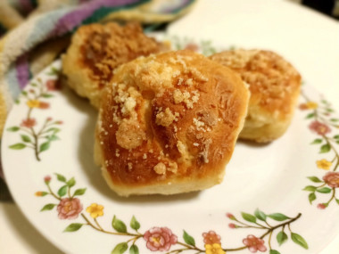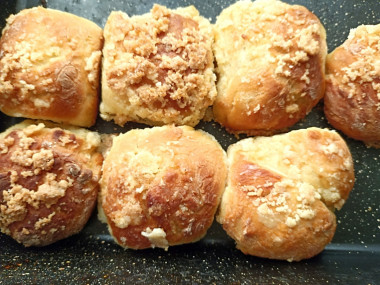 Булочки получились пышные, мягкие как пух с румяной хрустящей корочкой) к сожалению молока у меня не было, а в магазин идти было лень) по этому заменила его кефиром. И сахара в тесто добавила чуть больше, у меня дети сладкоежки. Но больше всего понравился сладкий рассыпчатый штрейзель. Спасибо за рецепт!