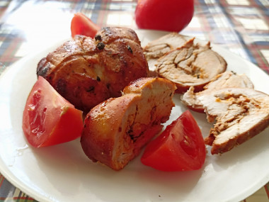 Меня заинтересовал этот рецепт своей легкостью. Буженину из куриных грудок я готовила по рецепту автора, но не удержалась и добавила чуть чуть меда))) Мне очень нравится, когда в маринаде для мяса присутствует мед. Грудки я свернула в рулетики и поместила в рукав для запекания, так как фольги у меня не было. В течение 45 минут пока мясо готовилось, вся семья наслаждалась ароматом, который заполнил всю квартиру)))))) К сожалению мясо не простояло и 3 часов в холодильнике, так как побыстрее хотелось его попробовать))))) Буженина из куриных грудок получилась сочной с аппетитной румяной корочкой и головокружительным ароматом пряностей