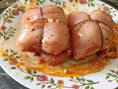 Меня заинтересовал этот рецепт своей легкостью. Буженину из куриных грудок я готовила по рецепту автора, но не удержалась и добавила чуть чуть меда))) Мне очень нравится, когда в маринаде для мяса присутствует мед. Грудки я свернула в рулетики и поместила в рукав для запекания, так как фольги у меня не было. В течение 45 минут пока мясо готовилось, вся семья наслаждалась ароматом, который заполнил всю квартиру)))))) К сожалению мясо не простояло и 3 часов в холодильнике, так как побыстрее хотелось его попробовать))))) Буженина из куриных грудок получилась сочной с аппетитной румяной корочкой и головокружительным ароматом пряностей Автору огромное спасибо)