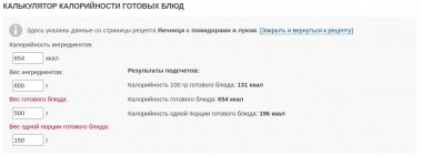 Вписано? Все готово! Тут же смотри калорийность целого блюда, в 100 граммах или в одной порции.