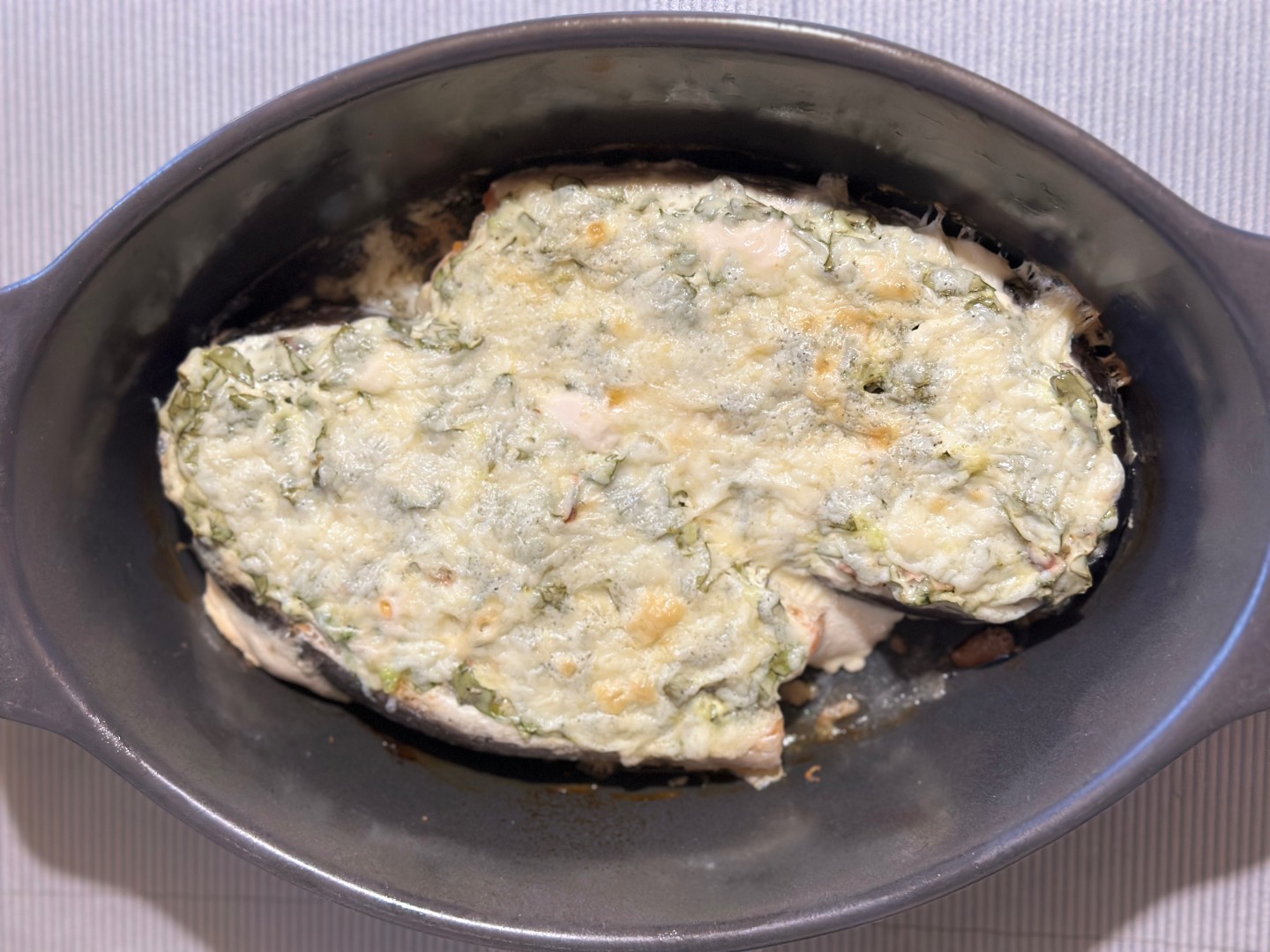 Когда-нибудь я обязательно научусь фотографировать красиво 😂 даже надеюсь в этой жизни) а пока мои фотографии не могут передать, какая вкусная и нежная получилась запеченная со шпинатом рыба 🔥 но она просто объедение! В морозилке были стейки, их я положила в керамическую форму для запекания. Чтобы рыба имела сбалансированный вкус, рекомендую дно формы, а не саму рыбу чуть-чуть посолить и добавить перец. Так нижняя сторона стейков тоже получит свою порцию вкуса. Шпинат нарезала мелко, смешала с чесноком, сметаной, черным свежемолотым перцем и сухим ленгграссом. Смесь разложила на стейки, сверху посыпала тертой моцареллой. Убрала в газовую хорошо разогретую духовку на 15 минут с фольгой и ещё 10 минут форма стояла без фольги. Бомбический вкус! Спасибо автору ❤️