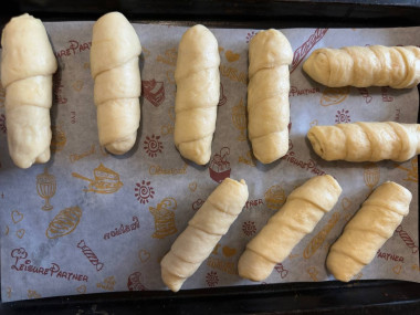 Идеальное тесто! Если делать именно в такой последовательности и в нужном количестве по рецепту, тесто получается очень мягким, при этом эластичным, очень вкусным. Сосиски были средние и тоже закрутила 10 штучек. В газовой духовке выпекала на 10 минут больше, а смазывала 1 желток + 1 ч.л. сметаны. Спасибо за рецепт