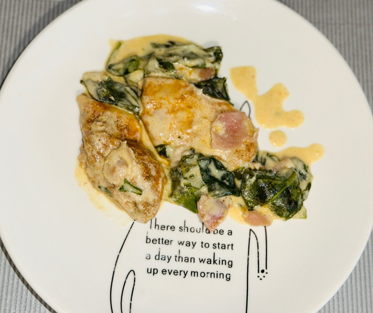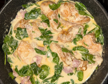 Когда увидела этот рецепт - сразу захотелось его приготовить, такое оно яркое! Для блюда я использовала 2 куска куриного филе, смешала паприку и растительное масло, обваляла в этой смеси филе. Нагрев сильно сковороду, переложила туда кусочки и обжарила с двух сторон до красивого золотого цвета. У меня в наличии был только сырокопченый бекон, поэтому соли я добавила минимум. Соус из белого сухого вина со сливками тушила до среднего загустения, после чего вернула в него кусочки курицы. Шпинат был достаточно крупным, я его немного порезала и, добавив к курице, тушила еще пару минут. Получилось не просто блюдо, а какой-то восторг. Оно многогранно в своем вкусе, курица нежнейшая, все сочетается друг с другом, не перебивает один компонент другой. Эстетично и колоритно!