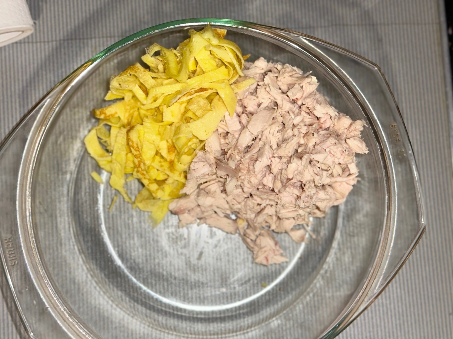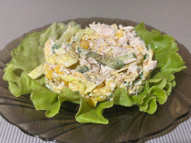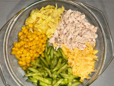 Очень свежий, яркий и аппетитный салат получился! Все ингредиенты сочетаются друг с другом. Огурец приятно освежает, курица и яйцо делают сытным. Сковороду для блинчика я взяла с больши диаметром и у меня он получился один. Сыр натерла на крупной терке, а огурец нарезала соломкой. Лучше всего огурец нарезать в самом конце, чтобы не было водянисто. Салат очень понравился, спасибо большое Ириша ❤️