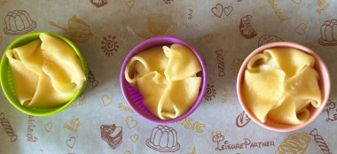 Этот замечательный рецепт из серии "ВСЕ ГЕНИАЛЬНОЕ - ПРОСТО"!!! Использование лаваша заметно сокращает время, и вы прекрасно успеете порадовать своих родных даже к вечернему чаепитию. Форму я использовала одноразовую, так как творога было всего 320 гр, то и лаваша взяла 115 гр. Вырезала заготовки с помощью ножниц). Изюм у меня никто не любит, поэтому не добавляла, но сахар не увеличивала, так как домашние любят есть в прикуску со сгущенным молоком