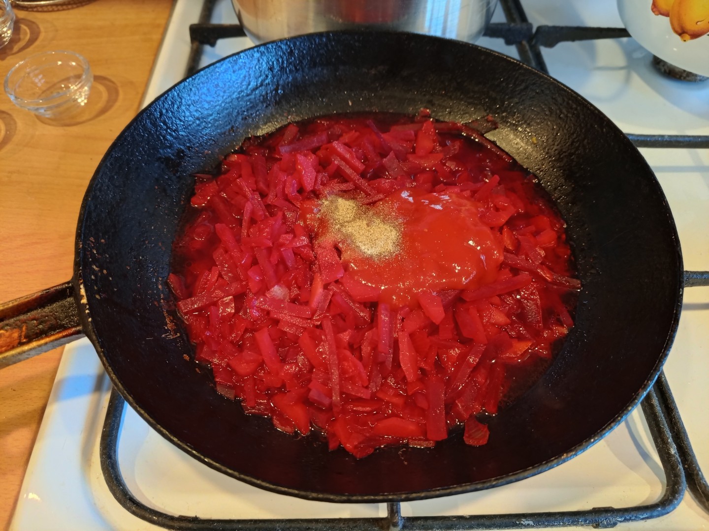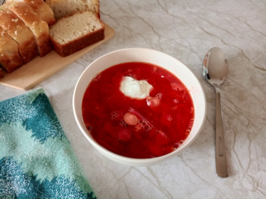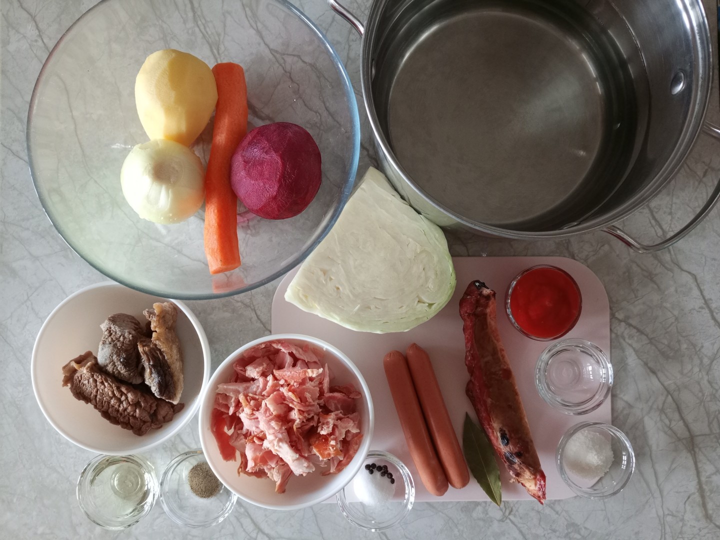 Всегда готовила борщ либо постный, либо на свинине. Этот рецепт привлек необычным мясным набором, и я решила попробовать, только внесла небольшие изменения: пересчитала ингредиенты на калькуляторе рецепта на 2 литра воды. Также, по привычке, добавила одну картофелину, нарезанную кубиками, и зажарку делала на растительном масле. Петрушки под рукой не оказалось, поэтому обошлась без неё. Я боялась, что при долгой варке свекла потеряет свой цвет, поэтому тушила овощи в сковороде на маленьком огне. Когда овощи были готовы, добавила к ним томатную пасту и уксус, и только потом отправила заправку в суп.