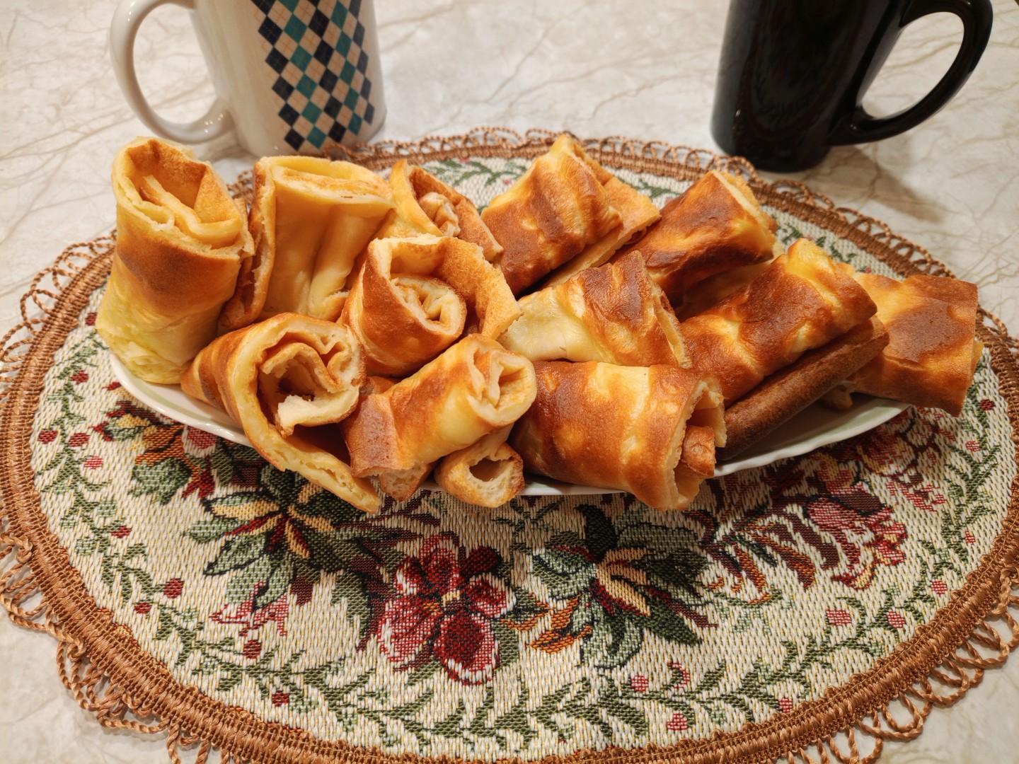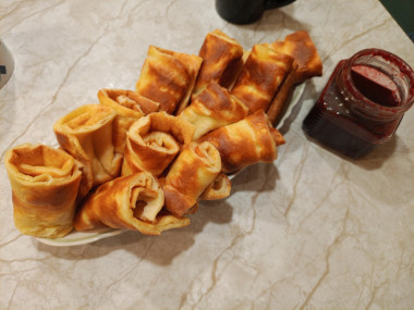 Подавала, нарезав ножницами на порции и свернув их в рулетики. Ели с домашним вареньем — сочетание вышло замечательным. Очень понравилось, что блинчики получились со вкусом бисквита, но при этом не крошатся, а ещё они не жирные! Для меня большой плюс, что не нужно стоять у плиты, рецепт из разряда “всё смешал, и в духовку”.