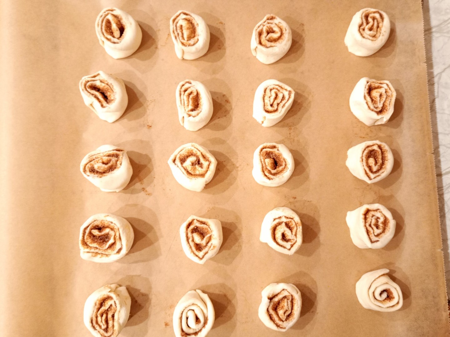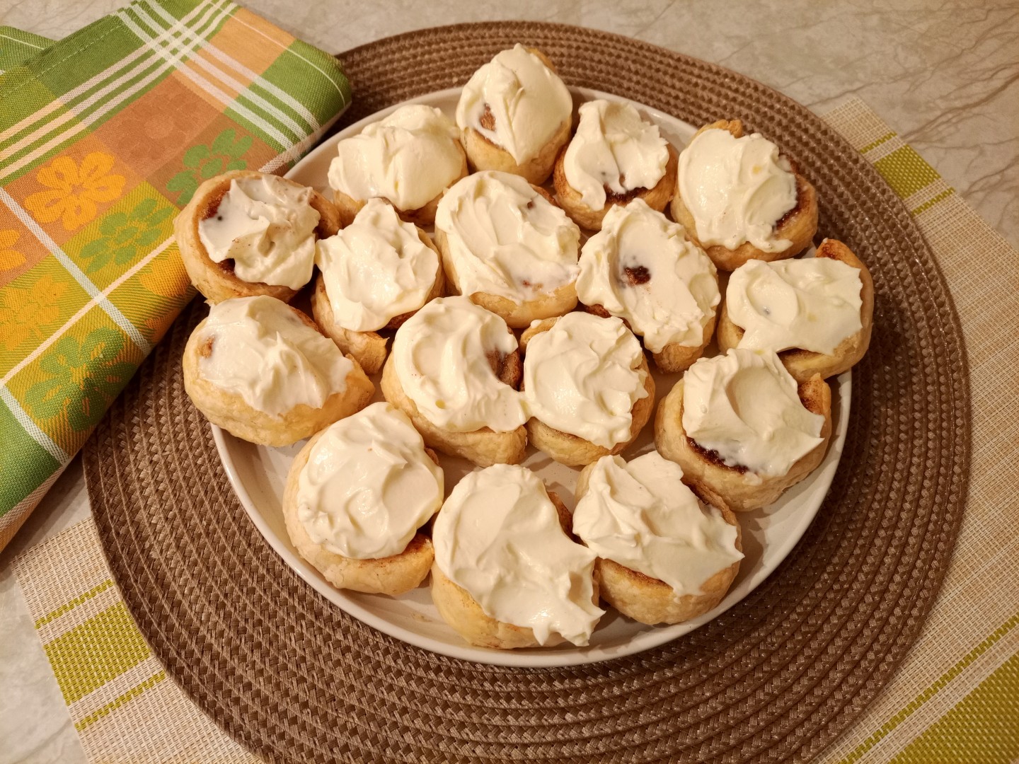 В процессе я внесла несколько изменений: для глазури у меня не оказалось сливок, поэтому я увеличила порцию творожного сыра и тщательно перемешала его с сахарной пудрой ложкой — миксер не понадобился, консистенция получилась идеально кремовой. Тесто у меня было в виде двух пластин, поэтому я решила сделать булочки поменьше. В итоге получилось целых 20 аккуратных синабонов.