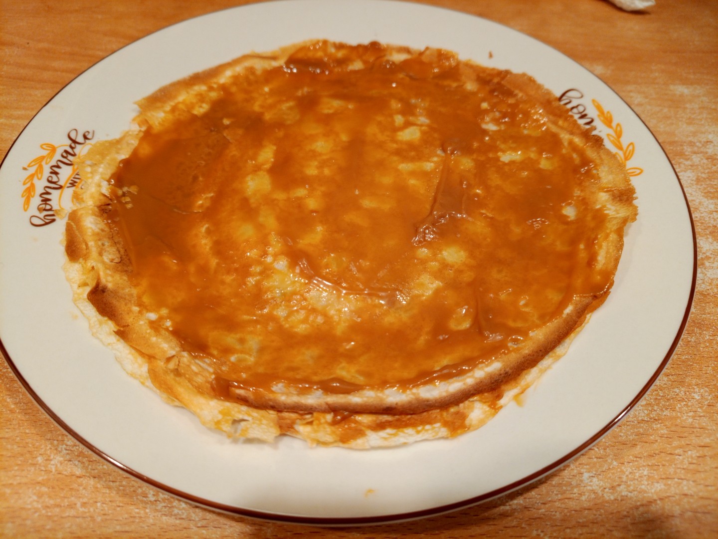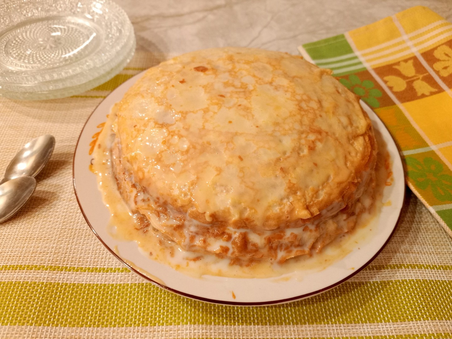 Сначала всё шло идеально: сгущенка таяла от тепла блинов, ложилась ровно и мягко. Но на последних двух-трёх слоях вареная сгущенка закончилась, поэтому на эти слои нанесла обычную сгущенку, и тортик немного «поплыл», но нас это ничуть не смутило.