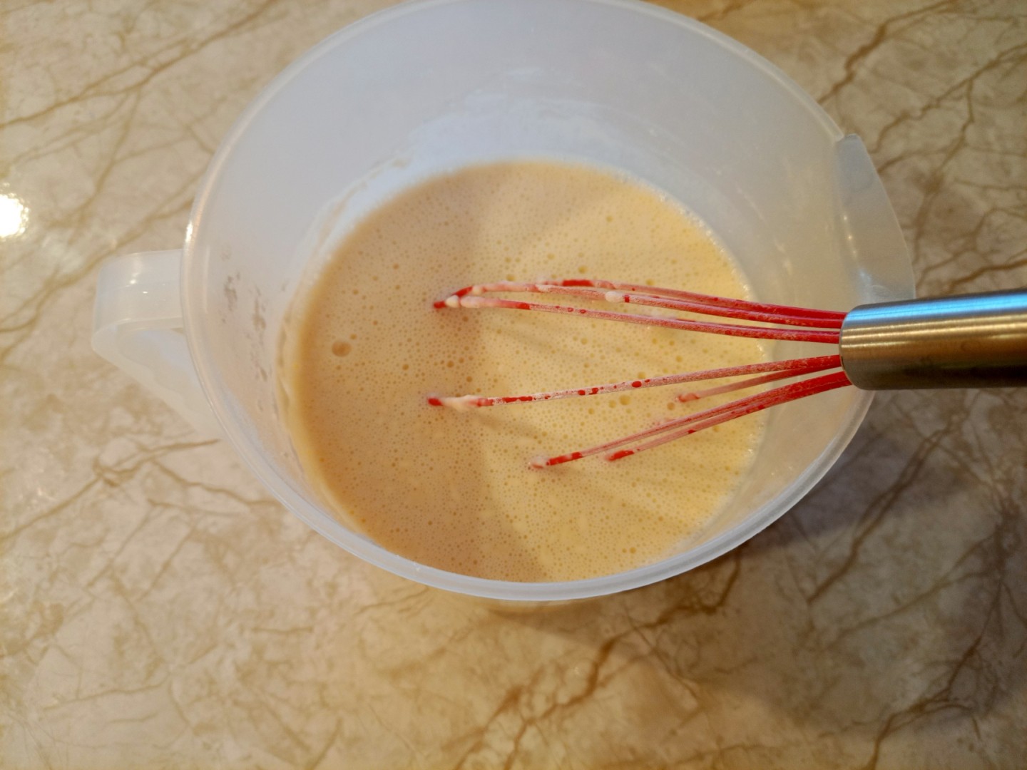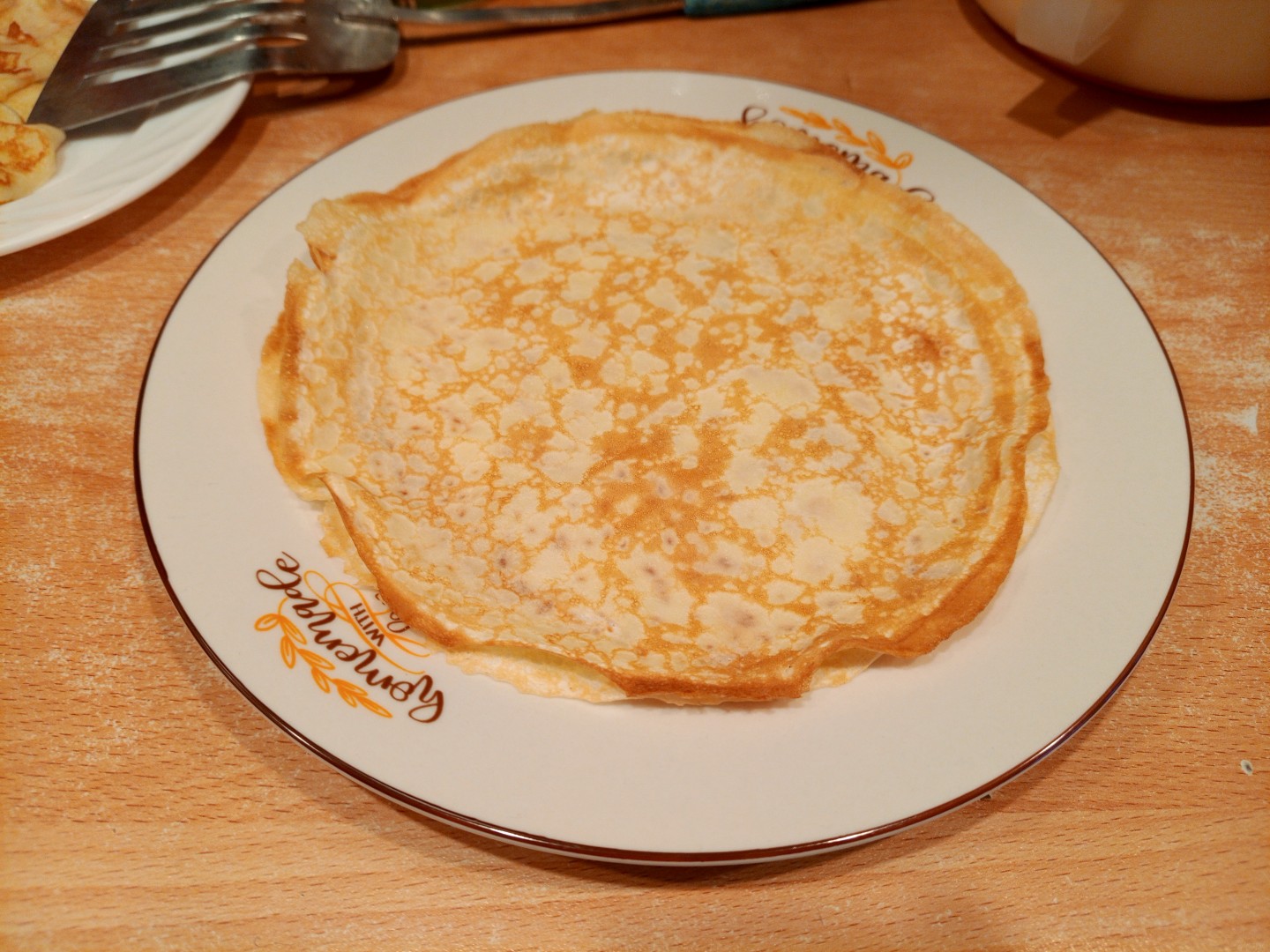 Готовила на полторы порции, пересчитала ингредиенты на калькуляторе рецепта. Муки у меня ушло примерно на треть больше, чем в рецепте: ориентировалась на то, что тесто должно быть консистенции жидкого йогурта. После пробного блина добавила в тесто еще одну столовую ложку сахара - мне захотелось послаще.