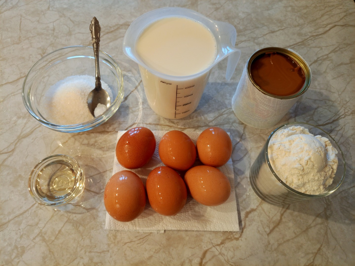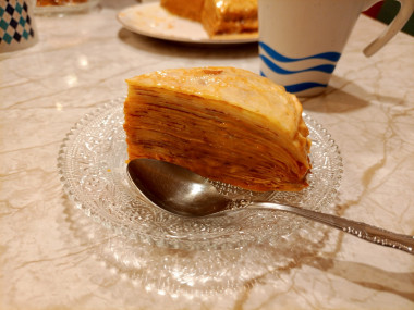 Блины испеклись быстро и ровно, нужно только приноровиться.У меня из указанного количества ингредиентов получилось около 25 штук. Вареная сгущенка у меня была очень густая. Я знала, что по рецепту блины должны остыть, но побоялась, что такой густой крем будет трудно намазывать на холодную поверхность. Поэтому решила рискнуть и собирала торт сразу, пока блины ещё были тёплыми.