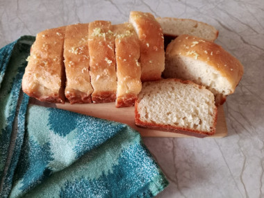 Я немного сымпровизировала: сразу после духовки сбрызнула горячий хлебушек водой и смазала смесью масла с чесноком. Накрыла полотенцем и дала остыть прямо в форме.