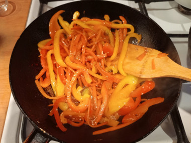 Внесла небольшие правки, ориентируясь на вкусы домочадцев и наличие продуктов. Поскольку кабачки у нас не в почёте, вместо цукини добавила ещё один болгарский перец — жёлтый, для яркости. Перца чили под рукой не оказалось, поэтому обошлась без него. Зато использовала готовый соевый соус с чесноком и чили, а рисовый уксус заменила на свежевыжатый лимонный сок — для кислинки.