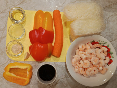 Приготовление заняло совсем немного времени. Овощи, нарезанные соломкой, быстро обжарились и пропитались соево-лимонным соусом. Готовила их буквально 5 минут, чтобы не разварились. Креветки, ароматизированные чесноком, стали идеальным дополнением. Фунчозу просто залила кипятком на 7 минут, промыла — и она готова.