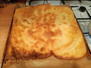 В духовке тесто вело себя очень зрелищно — невероятно поднялось, стало пузырчатым. Мои домашние были в восторге и сразу окрестили это «чудо-блином». После выпекания он, конечно, осел, но остался мягким внутри. Один край у меня немного подсох (думаю, что тесто я распределила не совсем равномерно) , но на вкусе это не отразилось — мне хрустящая корочка понравилась.