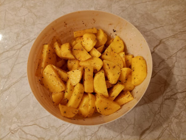 Немного увеличила порцию, взяла килограмм картошки, а остальные ингредиенты пересчитала на калькуляторе рецепта. Свежего укропа не оказалось, а розмарин был только в составе готовой смеси средиземноморских трав, поэтому я просто использовала её, объединив два компонента в одном. Чеснок тоже взяла сушёный, причём копчёный — очень люблю его аромат. В остальном придерживалась рецепта.